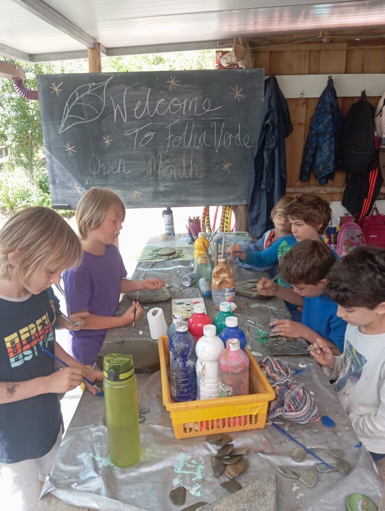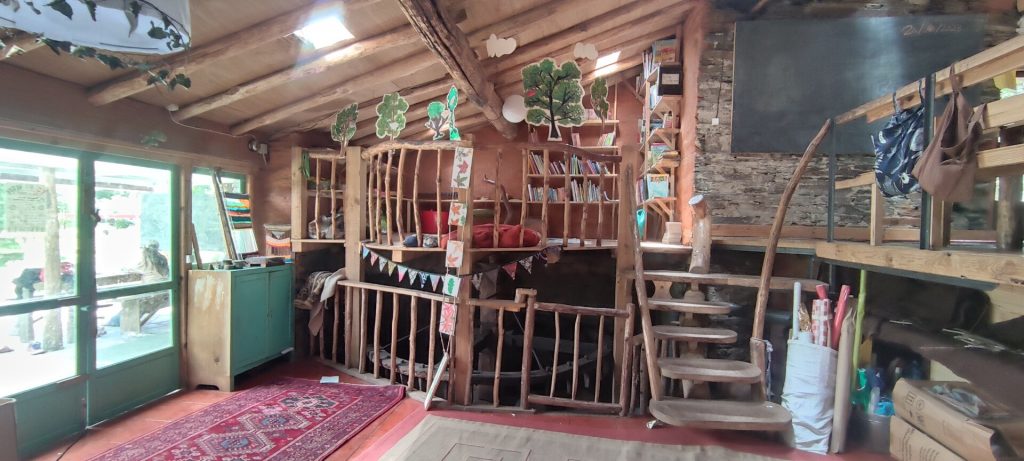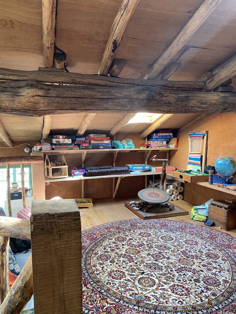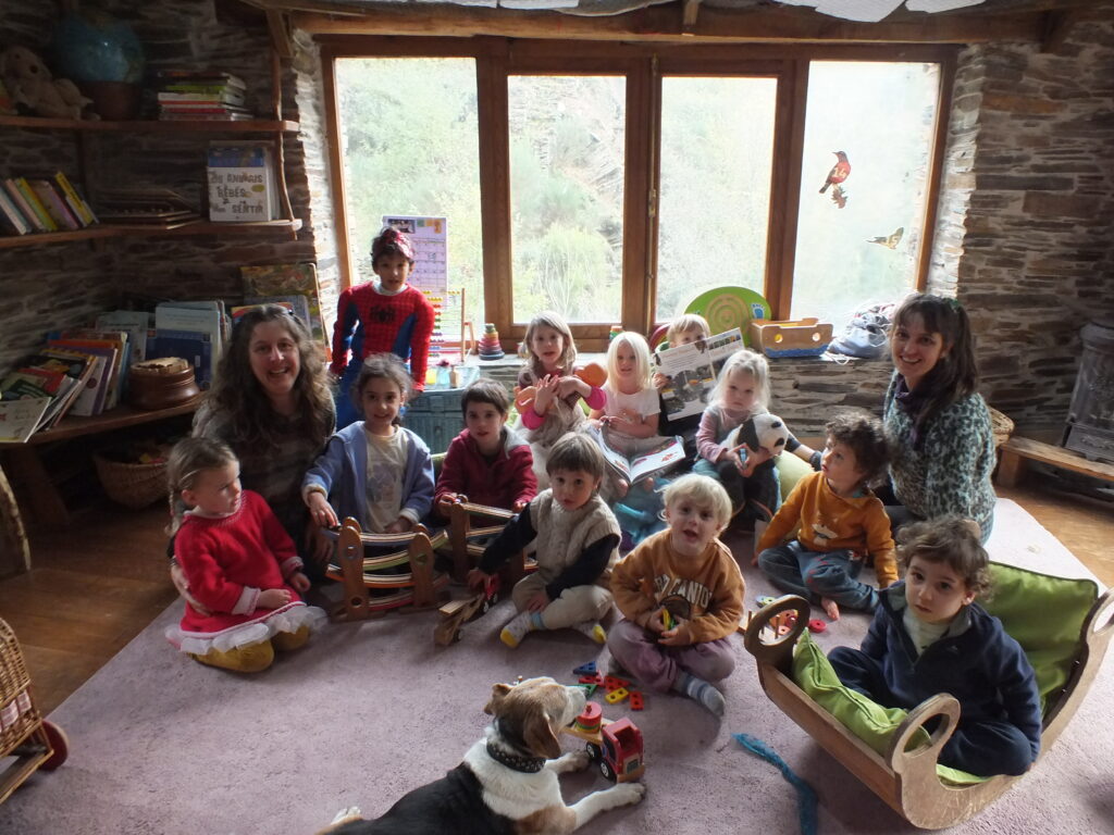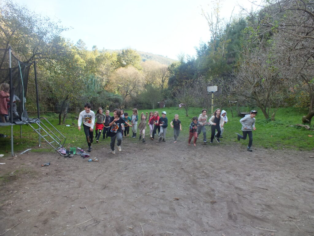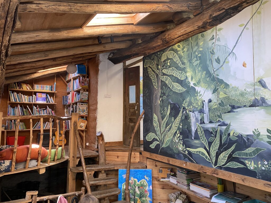 Next to the Lagar’s main building are our communal kitchen and an off-grid vermi-composting toilet, completing the welcoming and practical environment we’ve nurtured over the years. The playground is a lively and imaginative space, with a trampoline, climbing frame, child-designed “café,” two swing sets, a vegetable garden, a completely independently child created ‘Baba Garden’ and the much-loved “hole,” an ever-evolving project created and maintained by the children since day one. It’s something that truly has to be seen to be appreciated! We’ve also created several shaded areas, and the beautiful trees scattered throughout the space provide a cool, refreshing atmosphere during the summer months. In the extended garden on the valley floor we have a beautiful wilderness space to accommodate the Forest School which runs on Thursdays during term time.